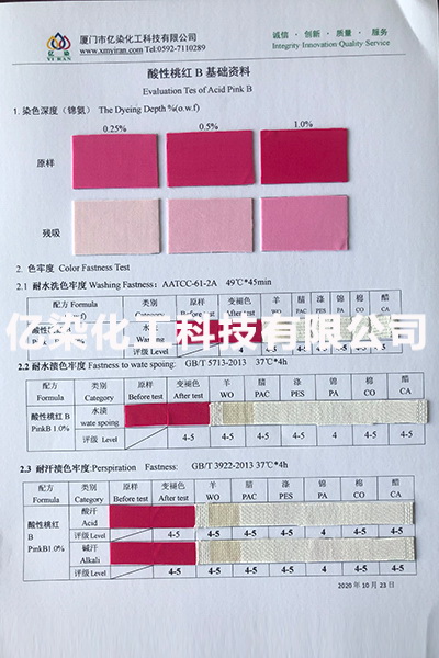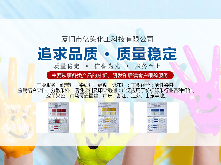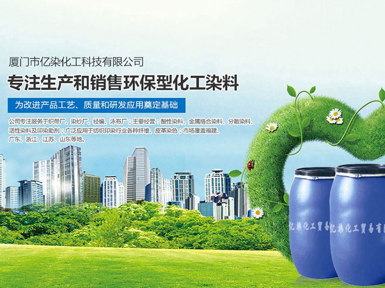 廈門市億染化工科技有限公司是一家集研發(fā)、生產(chǎn)、銷售一體的綜合型企業(yè)。公司主要經(jīng)營:酸性染料、金屬絡合染料、高牢度分散染料及印染助劑。公司信守“以誠信贏合作、以質(zhì)量贏市場、以創(chuàng)新贏發(fā)展、以服務贏生存”的企業(yè)精神服務于廣大客戶,多年以來建立了良好的市場口碑,市場遍布福建、廣東、浙江、江蘇、山東及東南亞國家,與多家知名企業(yè)建立了長期合作伙伴關系!